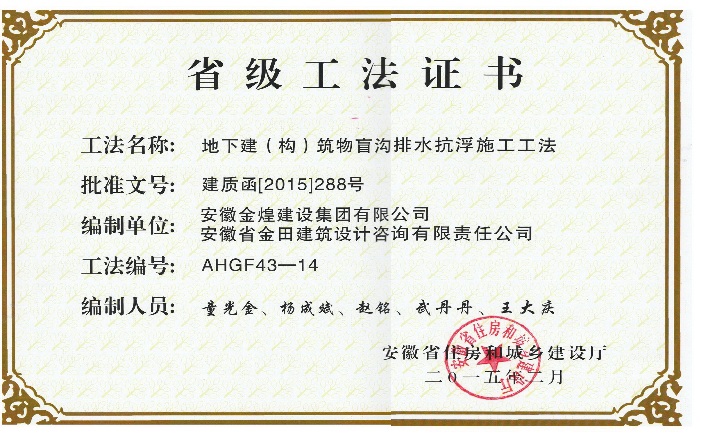 获得2014年度省级工法(地下建...