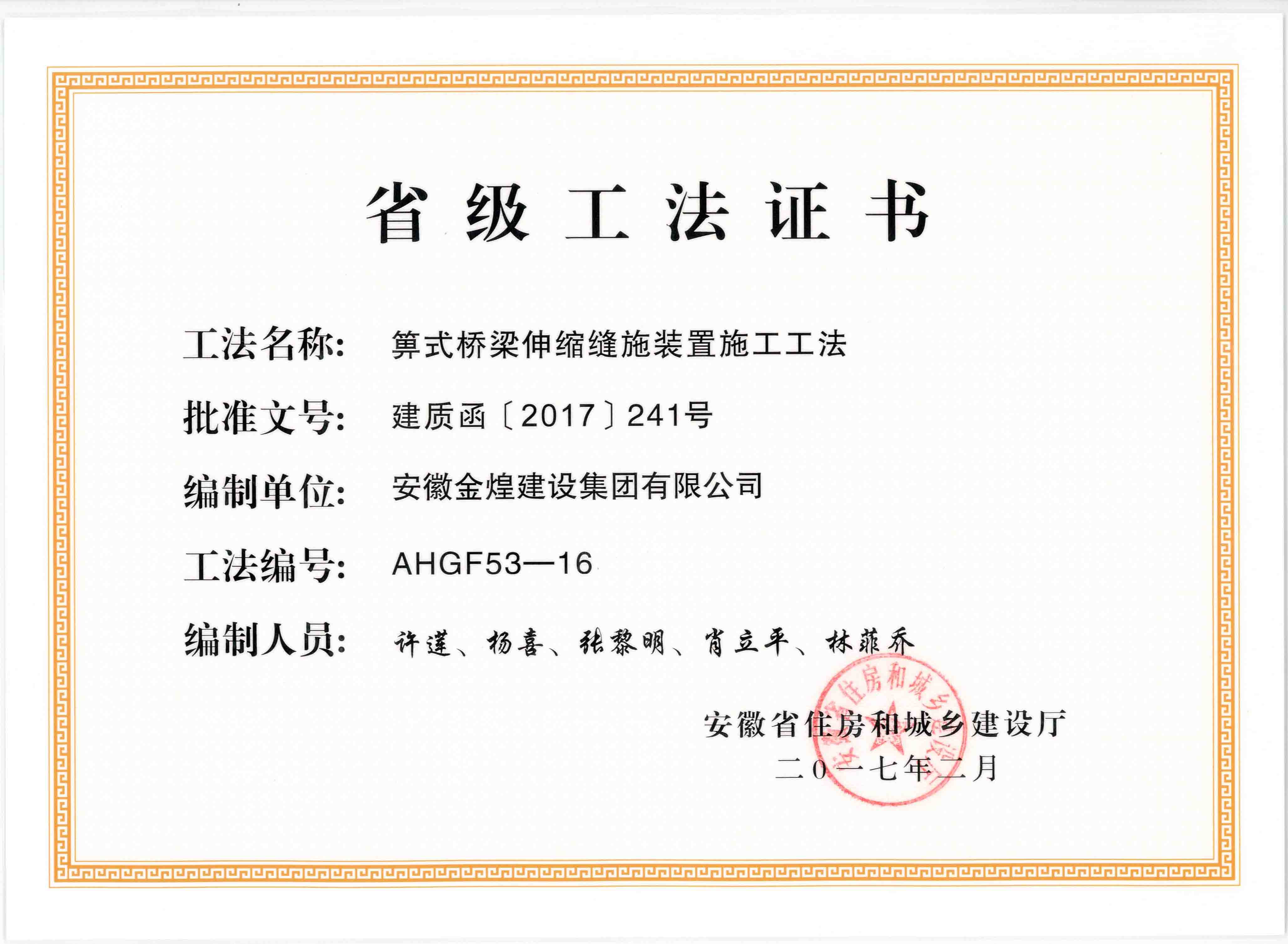 获得2016年度省级工法(箅式桥...