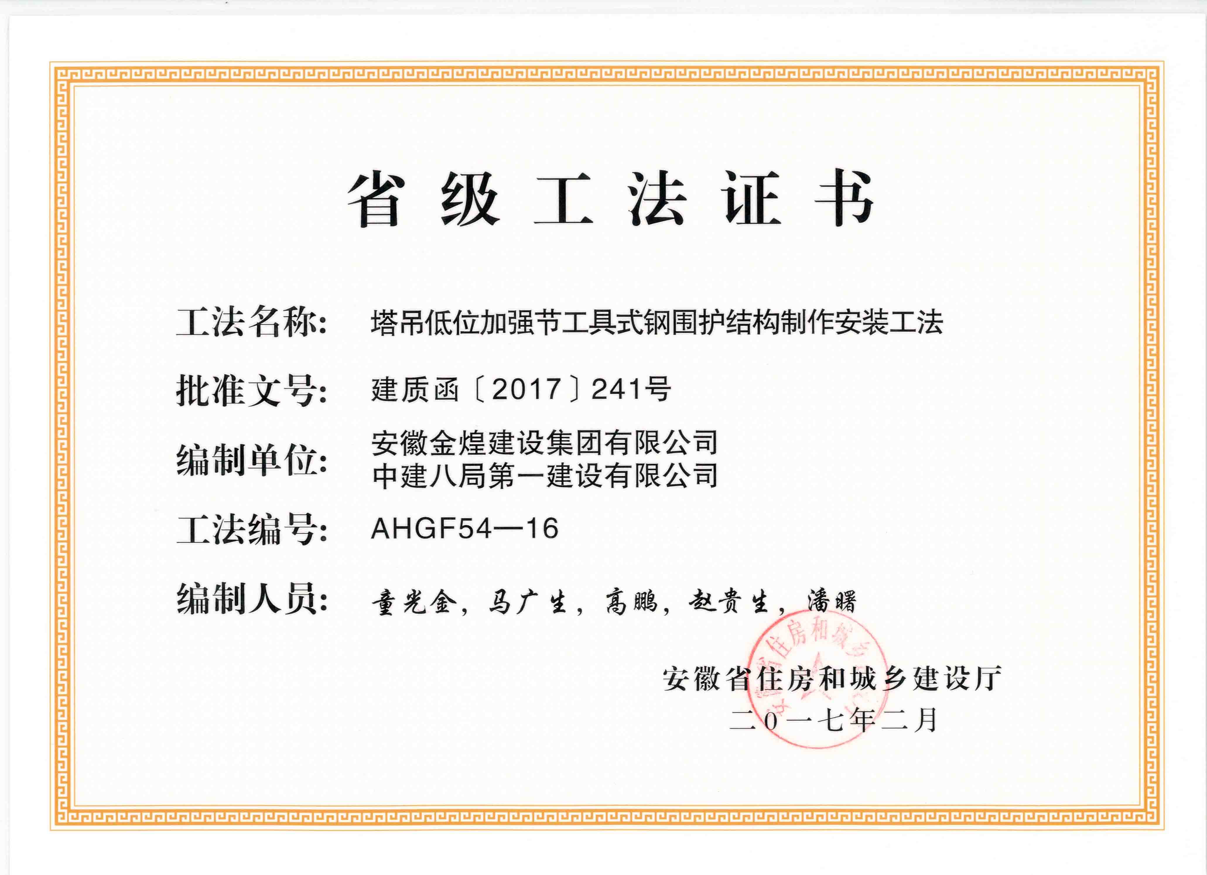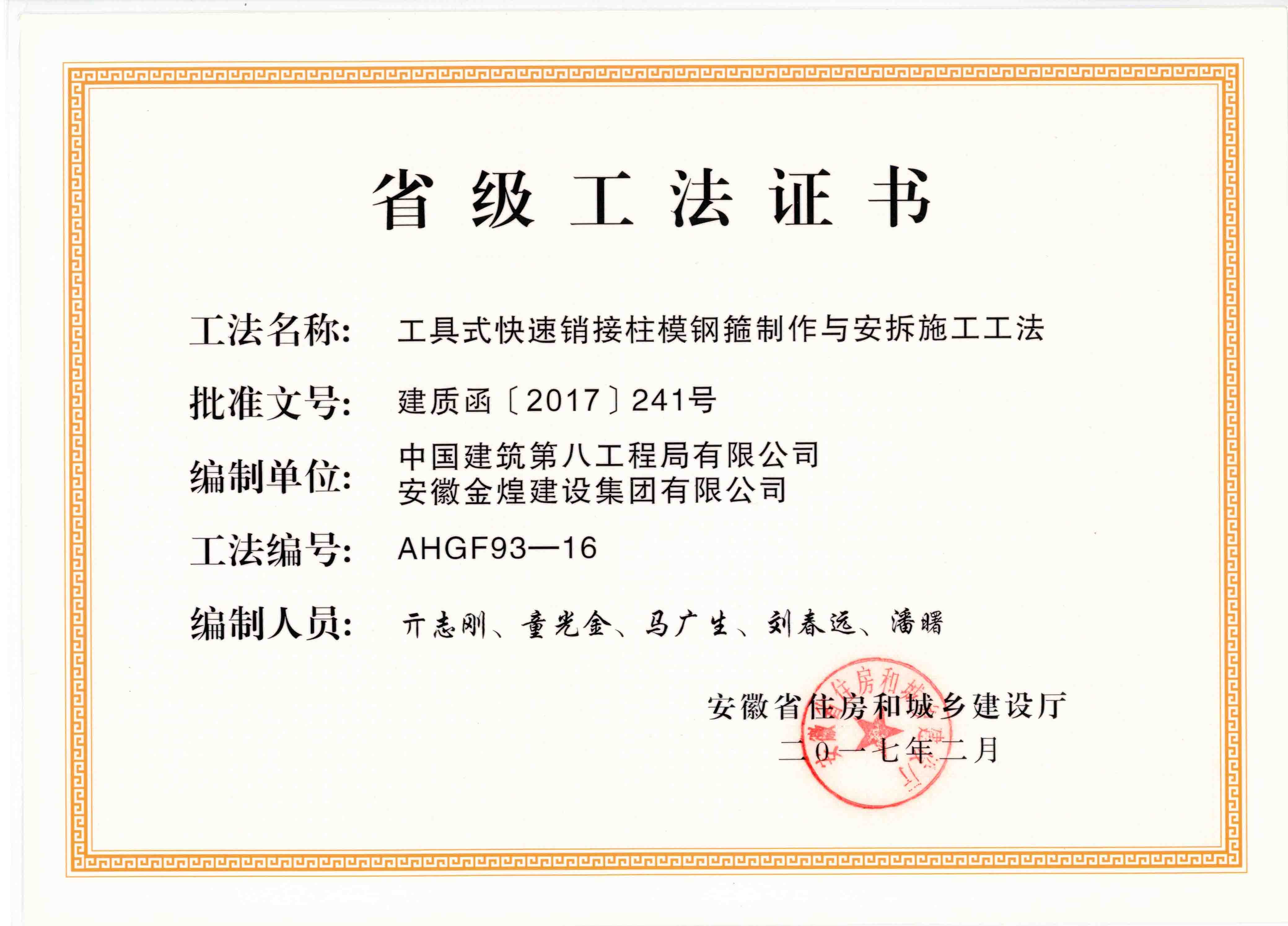 获得2016年度省级工法(工具式...