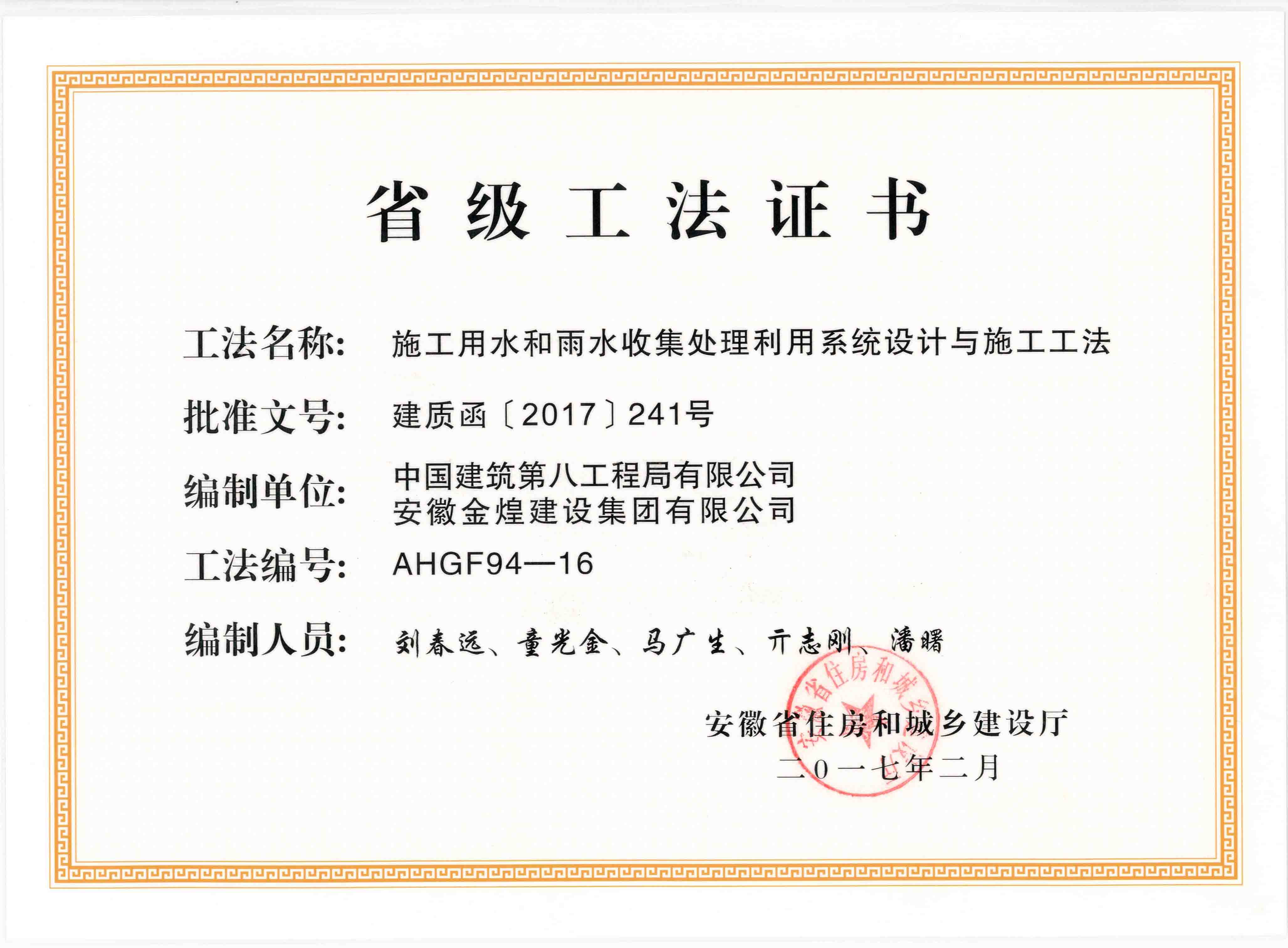 获得2016年度省级工法(施工用...