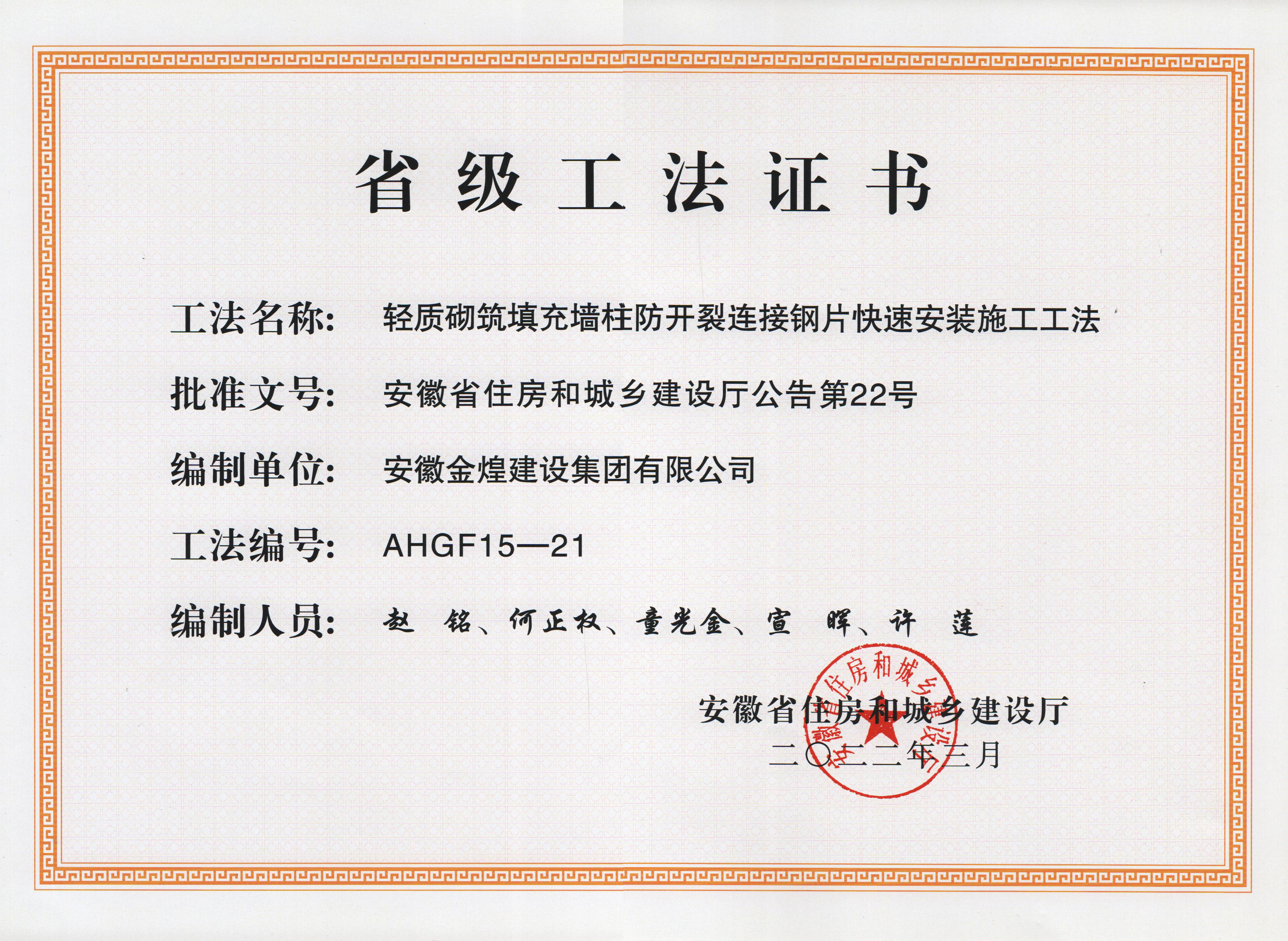 获得2021年度省级工法(轻质砌...
