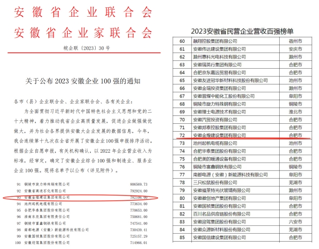 11月22日,对于金煌集团来说是个双喜临门的日子。安徽百强企业和安徽民营百强企业发布会在同一天向公众公布名列榜单,金煌集团同时获得两项殊荣,列居安徽百强企业第93位和安徽民营企业百强第72位。