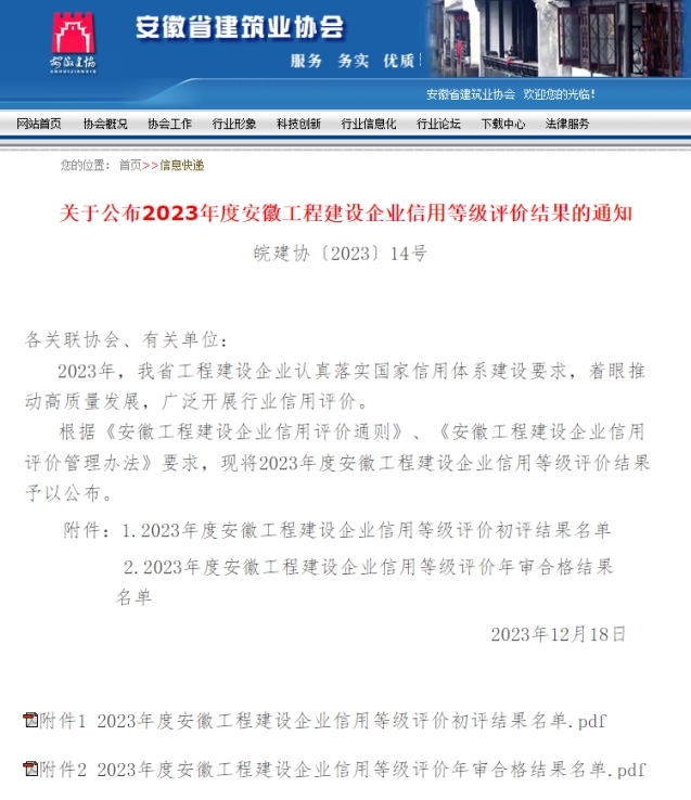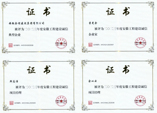 近日,安徽省建筑业协会发布的《关于公布2023年度安徽工程建设企业信用等级评价结果的通知》〔2023〕14号文件和《关于公布2023年度安徽工程建设诚信典型企业、诚信企业家、诚信项目经理名单的通知》皖建协〔2023〕15号文件中获悉,金煌集团继续保持安徽工程企业信用AAA等级,荣获2023年度安徽工程建设诚信典型企业,童光金董事长荣获2023年度安徽工程建设诚信企业家,余从云、斯志浩同志荣获安徽工程建设诚信项目经理称号。