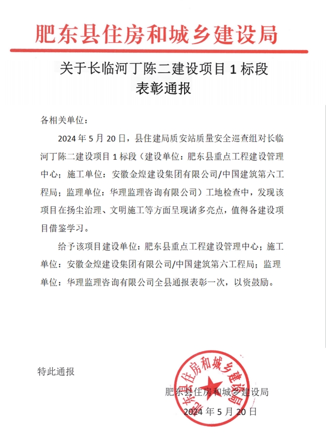 5月20日,肥东县住房和城乡建设局质安站对我公司承建的长临河镇丁陈二安置区建设项目EPC总承包1标段进行了随机检查。此次检查覆盖了项目的安全生产、质量控制、扬尘治理等多个方面。经综合评价,丁陈二建设安置区EPC总承包1标段建设项目在各项指标上均达到了优秀水平,特别是在项目扬尘治理、安全文明施工、关键岗位履责等方面呈现诸多亮点,获得了肥东县住房和城乡建设局的高度认可,并对该项目作出表彰通报。