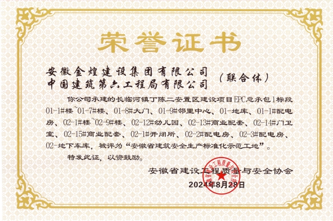 近日,从安徽省建设工程质量与安全协会传来喜讯,金煌集团有限公司承建的长临河镇丁陈二安置区建设项目EPC总承包1标段凭借其卓越的安全生产管理和标准化的施工流程,荣获“2024年度安徽省建筑安全生产标准化工地”。这一荣誉不仅彰显了金煌集团在建筑工程领域的雄厚实力,更是对金煌人长期以来坚持安全生产、追求品质工程的高度认可。