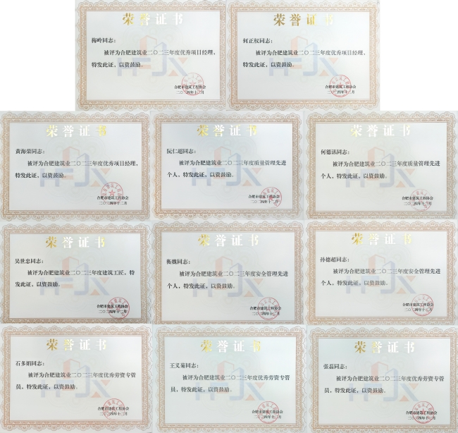 2023年度以来,建筑行业呈现增幅缓慢的趋势,行业面临着较大的压力。金煌集团积极推进建筑产业现代化,攻坚克难,开拓进取,整体发展稳中有进,成绩斐然,培养出一批优秀的人才。梅岭、何正权、黄海荣三位项目经理凭借出色的项目管理能力和专业素养,荣获合肥市建筑业优秀项目经理称号。阮仁超、何德讯两位同志在质量管理工作中表现突出,被评为合肥市建筑业质量管理先进个人。衡魏、孙德超两位同志在安全管理方面成效显著,荣获合肥市建筑业安全管理先进个人殊荣。吴世忠同志以精湛的技艺和工匠精神,在安徽省建筑业技能大赛中脱颖而出,成为建筑工匠的杰出代表。石多娟、王义菊、张磊三位劳资专管员在保障农民工权益、推进劳资管理工作等方面成绩优异,获评合肥市优秀劳资专管员。
