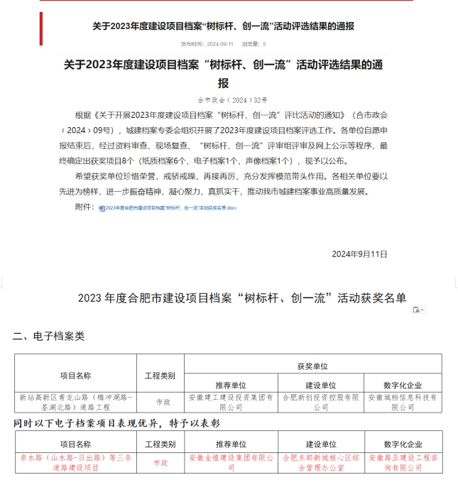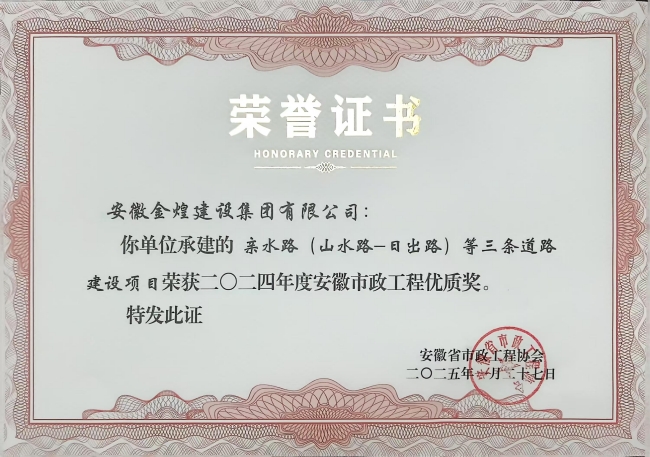 近期,从安徽省市政工程协会发布的“关于2024年度安徽市政工程优质奖拟获奖项目名单的公示”中获悉,金煌集团承建的亲水路(山水路-日出路)等三条道路建设项目荣获安徽市政工程优质奖。无独有偶,该项目在合肥市市政协会发布的“树标杆、创一流”活动中脱颖而出,在合肥市建设项目档案“树标杆、创一流”活动的电子档案类受表彰。