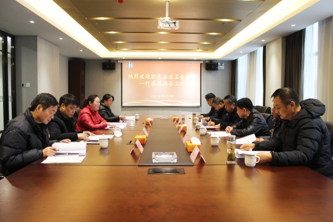 在会议室,肥东县总工会领导听取了企业工会工作汇报。工会主席许莲介绍了近年来企业工会在爱心助学、消费帮扶、战高温送清凉、参加各类工会活动等方面所做的工作和取得的成绩。领导们一同观看了企业的宣传片和工会资料汇编。肥东县工会各部门领导与企业对接了工会工作的相关业务,同时他们对企业在工会工作中取得的成效给予了高度评价,并就如何进一步加强工会组织建设、丰富职工文化生活等方面提出了指导性意见。