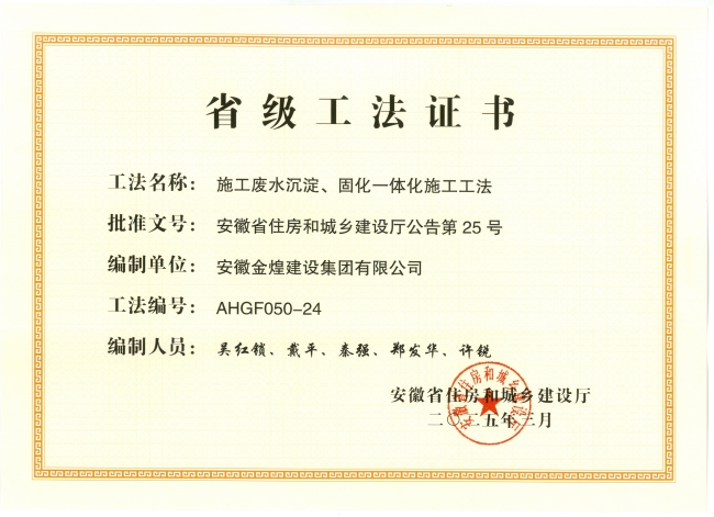 近日,从安徽省住房和城乡建设厅传来喜讯,金煌集团申报的“施工废水沉淀、固化一体化施工工法”,荣获安徽省2024年度省级工法。这一荣誉不仅是对金煌集团在建筑施工领域技术创新能力的高度认可,更是其积极践行绿色发展理念的有力见证。