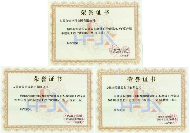 近日,从合肥市建筑工程协会官网获悉,金煌集团承建的JK202207地块项目2-G2#楼、2-G3#楼以及硕金大街项目2#楼荣获2025年合肥市建筑工程“琥珀杯”(市优质工程)奖。这是施工团队凭借精湛的施工工艺和卓越的工程品质,从全市参评项目中脱颖而出,一举摘得合肥市建筑行业最高荣誉。