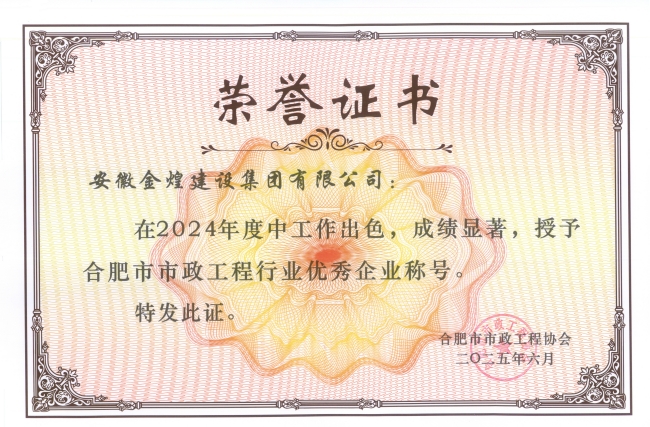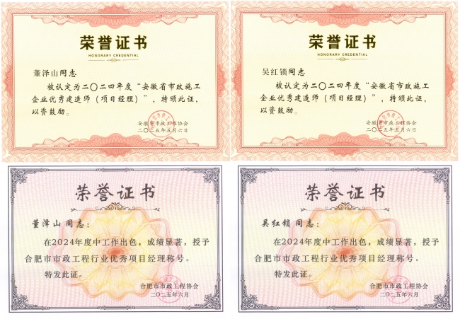 近日,从安徽省市政工程协会和合肥市市政工程协会传来喜讯,金煌集团凭借在市政工程领域的卓越表现,荣获2024年度安徽省优秀市政企业和合肥市优秀市政企业称号。同时,公司选报的董泽山、吴红锁两位同志,凭借丰富的项目管理经验和出色的领导能力,被评为安徽省和合肥市市政施工企业优秀项目经理。