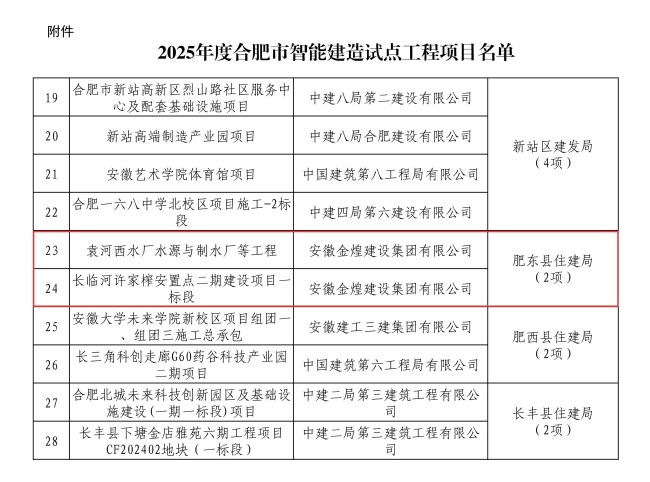 近日,合肥市城乡建设局公告2025年度合肥市智能建造试点工程项目名单。安徽金煌建设集团有限公司承建的袁河西水厂水源与制水厂等工程与长临河许家榨安置点二期建设项目一标段两个项目成功入选,成为肥东县唯一获评的两个项目,分别占据建筑工程和市政公用工程两大类别的试点代表席位。