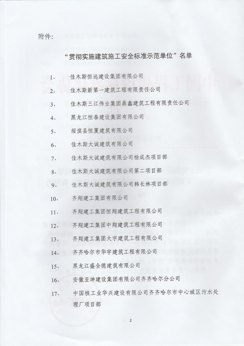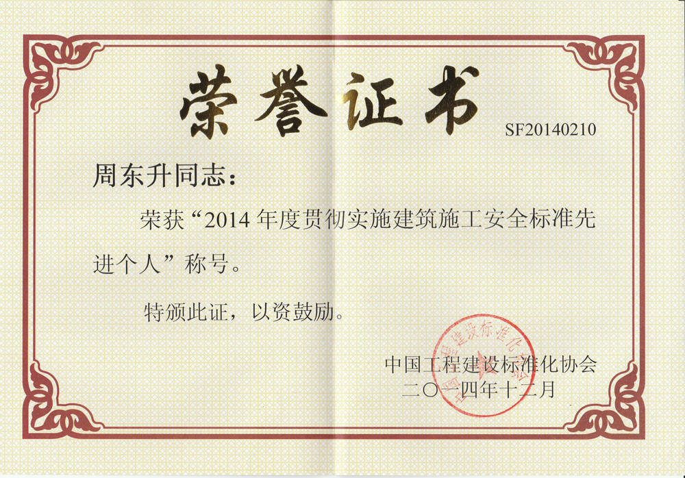 2014集团公司荣获“贯彻实施建筑施工安全标准示范单位”荣誉证书
