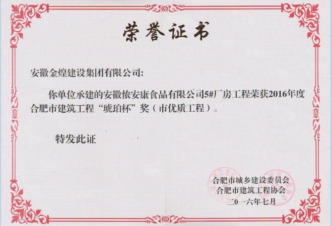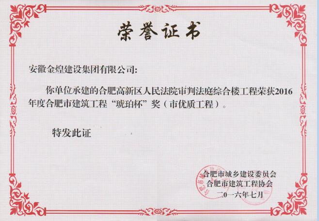 在集团领导的统一部署和大力支持下,在项目部团队的不懈努力下,经过申报、初评、专家组评选、网上公示等程序,由合肥市住房和城乡建设委员会及合肥市建筑业协会创优组审定,集团承建的合肥市高新区人民法院审判法庭综合楼工程和安徽侬安康食品有限公司5#厂房工程同时荣获2016年度合肥市优质工程——“琥珀杯”奖。