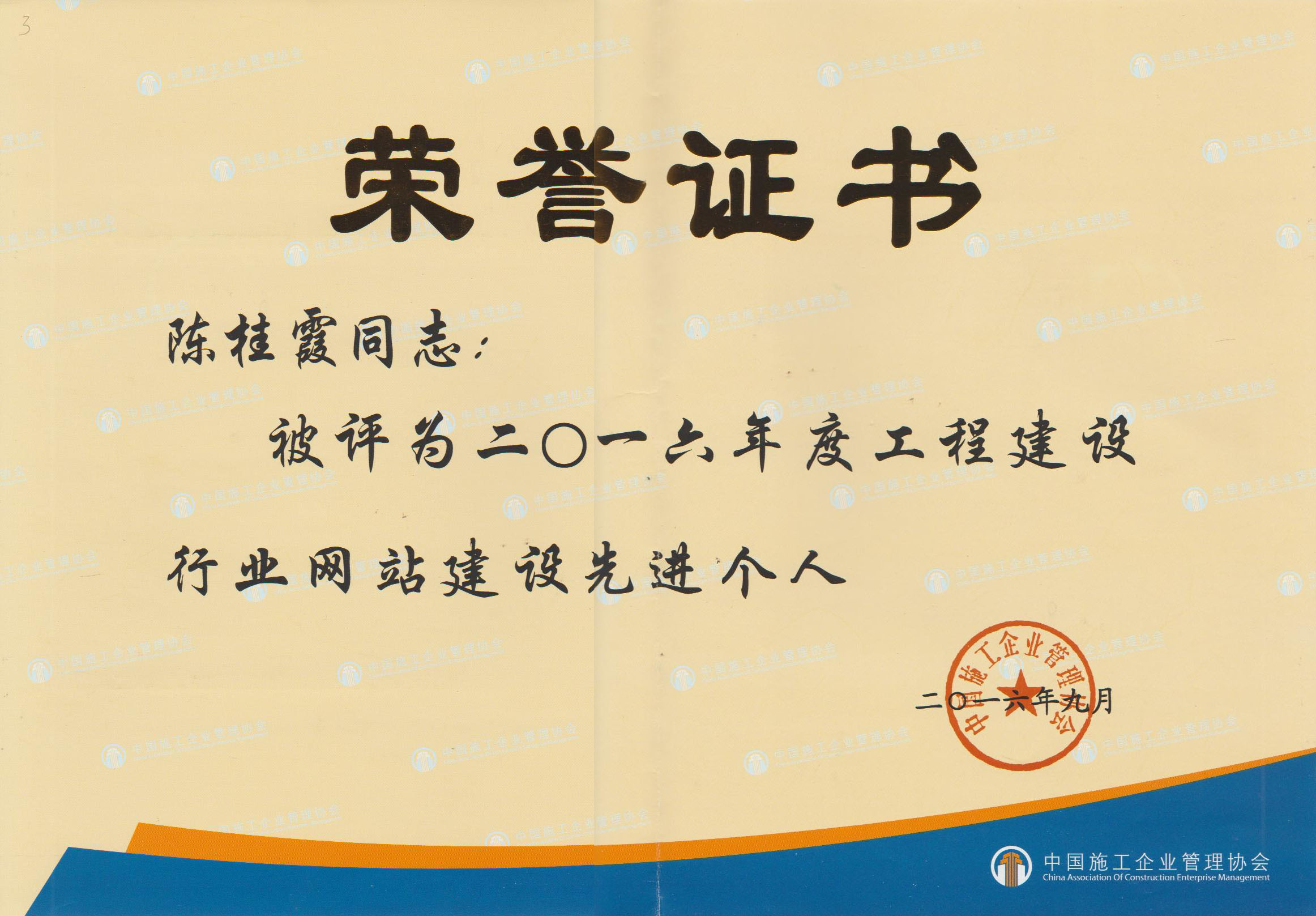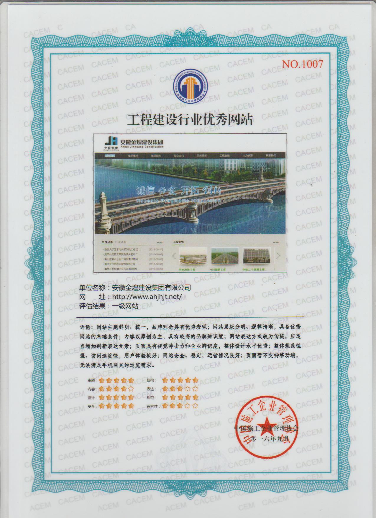 金煌集团网站再次被评为全国建设工程行业一级优秀网站,集团公司陈桂霞同志被评为建设网站先进个人称号。