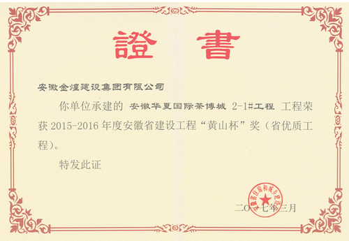 近日,从安徽省住房和城乡建设厅获悉,由安徽金煌建设集团承建的安徽华夏茶博城项目荣获2015-2016年度安徽省建设工程“黄山杯”奖。