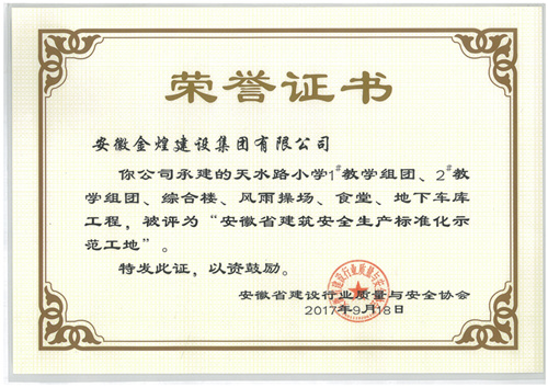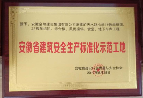近期,从安徽省建筑安全协会传来喜讯,由安徽金煌建设集团承建的天水路小学项目荣获“安徽省建筑安全生产标准化示范工地”称号。