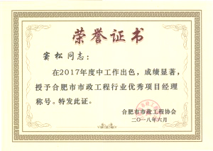 此次会议对荣获2017年度合肥市市政工程优秀企业、优秀项目经理进行表彰,89家会员单位获得“合肥市市政工程优秀企业”证书,170名项目经理获得“合肥市市政工程优秀项目经理”证书。集团公司自13年起蝉联五年荣获“合肥市政工程优秀企业”,一级建造师乐家努、窦松两位同志荣获“2017年度合肥市市政优秀项目经理”称号 。