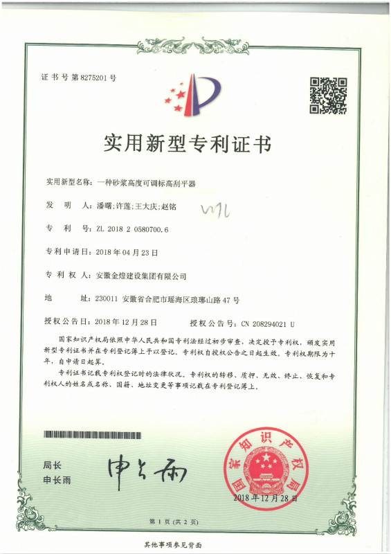 近日,从安徽省住房和城乡建设厅获悉由安徽金煌建设集团有限公司研发申报的“一种砂浆高度可调标高刮平器”和“一种锯齿形水泥膏限厚刮刀”获得国家知识产权局实用新型专利授权。