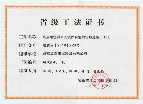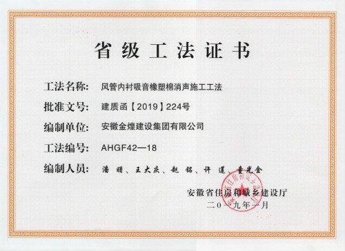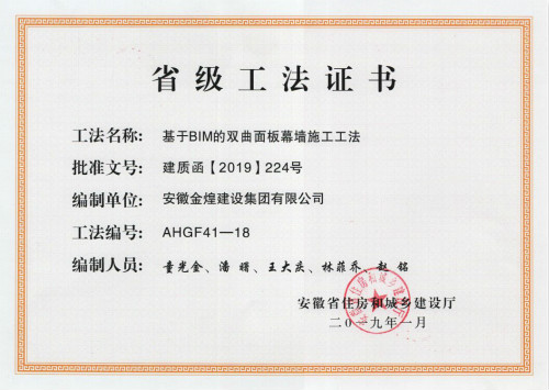 近日,安徽省住房和城乡建设厅颁发了2018年度安徽省省级工法证书。安徽金煌建设集团共获得了《基于BIM的双曲面板幕墙施工工法》《风管内衬吸音橡塑棉消声施工工法》《高层建筑封闭式液固自消能垃圾道施工工法》三项工法。
