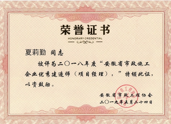 “安徽省优秀市政施工企业和优秀市政项目经理”评选活动是由安徽省市政工程协会组织,旨在表彰先进,树立榜样,发挥优秀施工企业在安徽省工程建设行业的示范引领作用,促进工程建设行业持续健康科学发展。经专家评审委员会审定,公司从众多参评单位中脱颖而出,以优异成绩获得此项荣誉。