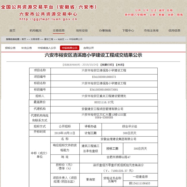近日,从六安市公共资源交易中心获悉,我公司参与竞争投标的六安市裕安区清溪路小学建设工程项目,通过层层角逐,最后入选第一中标人资格。
