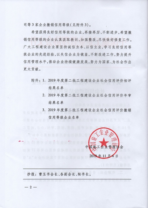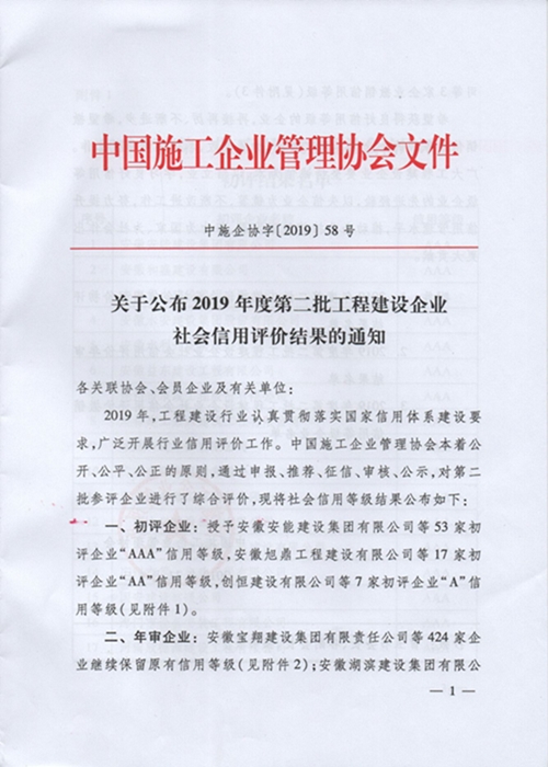 会上,曹玉书会长指出,今年是协会开展诚信体系建设15周年,新中国成立70周年以来,工程建设行业取得了前所未有的发展。工程建设企业社会信用评价是对处于业内领先企业综合实力、履约能力、社会信誉等多方面的综合评价。工程建设社会信用等级,是中国施工企业管理协会信用评价工作委员会为贯彻落实国家信用体系建设要求,规范推进工程建设行业信用体系建设而设置的。其中,“AAA级”作为施工企业信用评级三级五等中的最高级别,是对信用单位企业素质、诚信意识、经营状况、履约能力、社会信誉等各项指标的肯定。