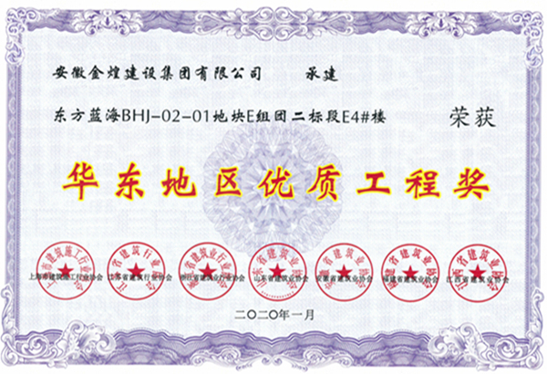 由安徽金煌建设集团有限公司承建的东方蓝海BHJ-02-01地块E组团二标段E4#楼项目,经过企业申报、专家复查和协会推荐等环节,通过专家评委们综合评议和无记名投票,喜获“华东杯”优质工程奖。