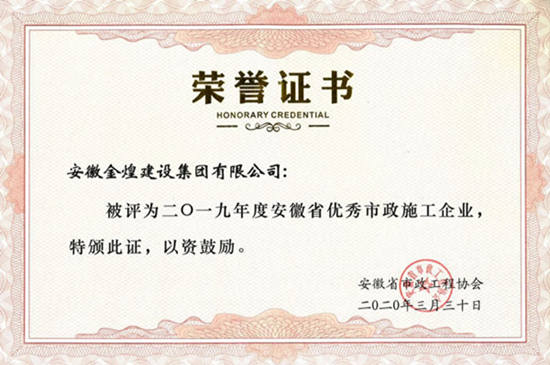近日,从安徽省市政公用工程协会获悉,金煌集团凭借良好的经营业绩和社会信誉,从众多同行单位中脱颖而出,荣获“2019年度安徽省优秀市政施工企业”称号,项目负责人窦松同志荣获“2019年度安徽省优秀市政建造师(项目经理)”称号。