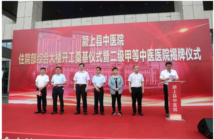 颍上县县委副书记、县长窦灿辉,阜阳市卫健委副主任马振华、颍上县委副书记徐云飞、颍上县中医院党支部书记、院长刘立广等出席揭牌仪式。仪式由颍上县委副书记徐云飞主持。县直有关部门主要负责同志,颍上县中医院领导班子成员,医共体成员单位负责人,金煌集团施工方代表共200余人参加揭牌仪式。此次建设的颍上县中医院住院部综合大楼为钢筋混凝土框架剪力墙结构,地上21层,地下1层,总建筑面积104951.59平方米,其中地上93609.52平方米,地下11342.07平方米,造价约3.9亿元。
