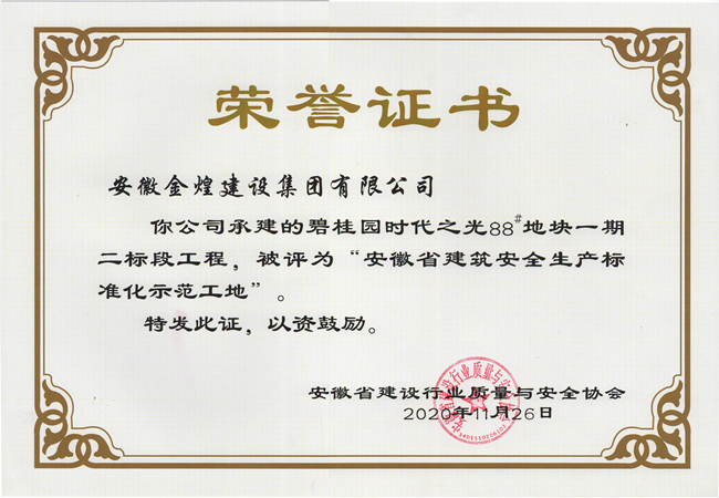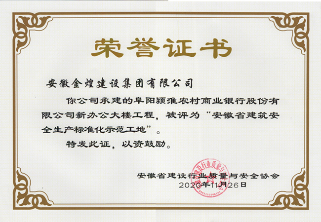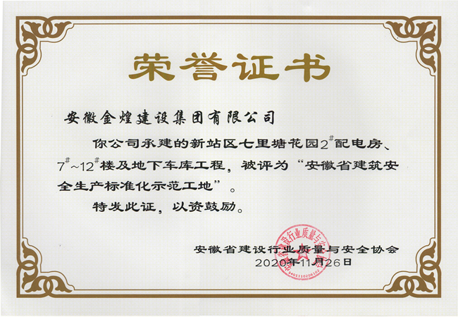 近日,从安徽省建设行业质量与安全协会获悉,在2020年第三批安徽省建筑安全生产标准化工地公布的名单中,金煌集团承建的新站区七里塘花园2#配电房、7#-12#楼及地下车库工程、碧桂园时代之光88#地块一期二标段工程、阜阳颍淮农村商业银行股份有限公司新办公大楼,三个项目获此殊荣。
