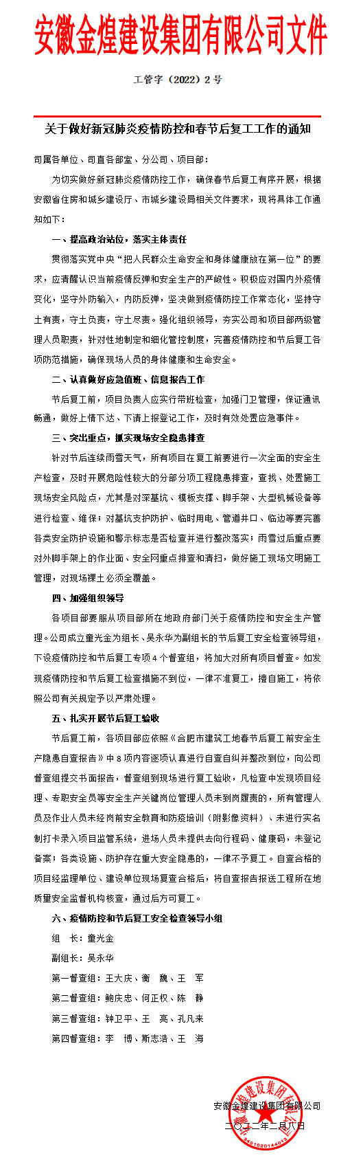 集团公司疫情防控和节后复工安全检查组分工一览表