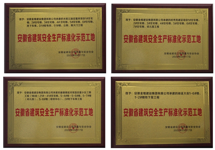 近日,从安徽省建设工程质量与安全协会公布2022年度第三批安徽省建筑安全生产标准化工地名单获悉,金煌集团承建的撮镇镇瑶河家园安置小区三期工程(1标段)工程项目、岭秀苑建设工程项目、水阳江路安置房工程项目、硕金大街工程项目荣获2022年度第三批“安徽省建筑安全生产标准化示范工地”称号。