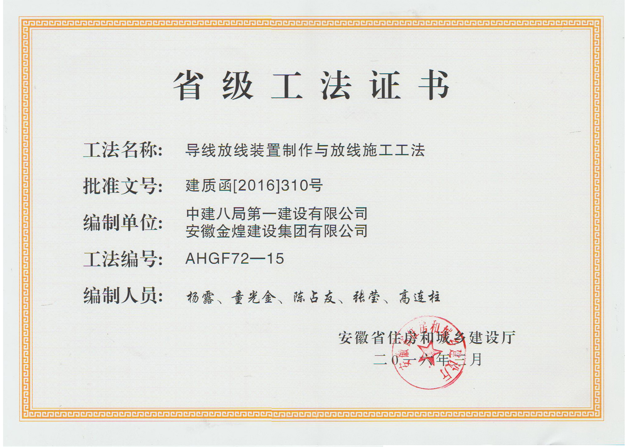 获得2015年度省级工法(导线放...