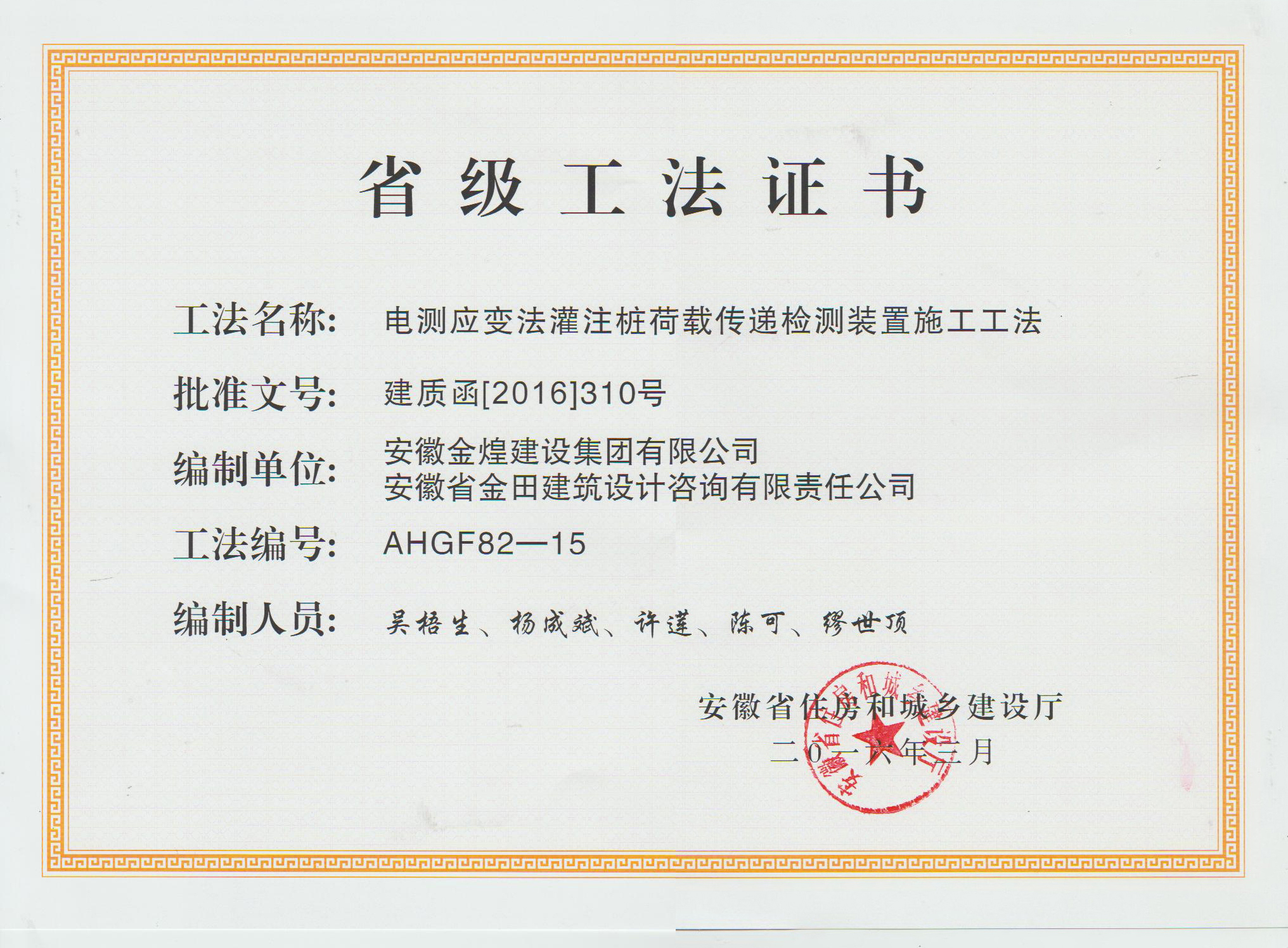 获得2015年度省级工法(电测应...