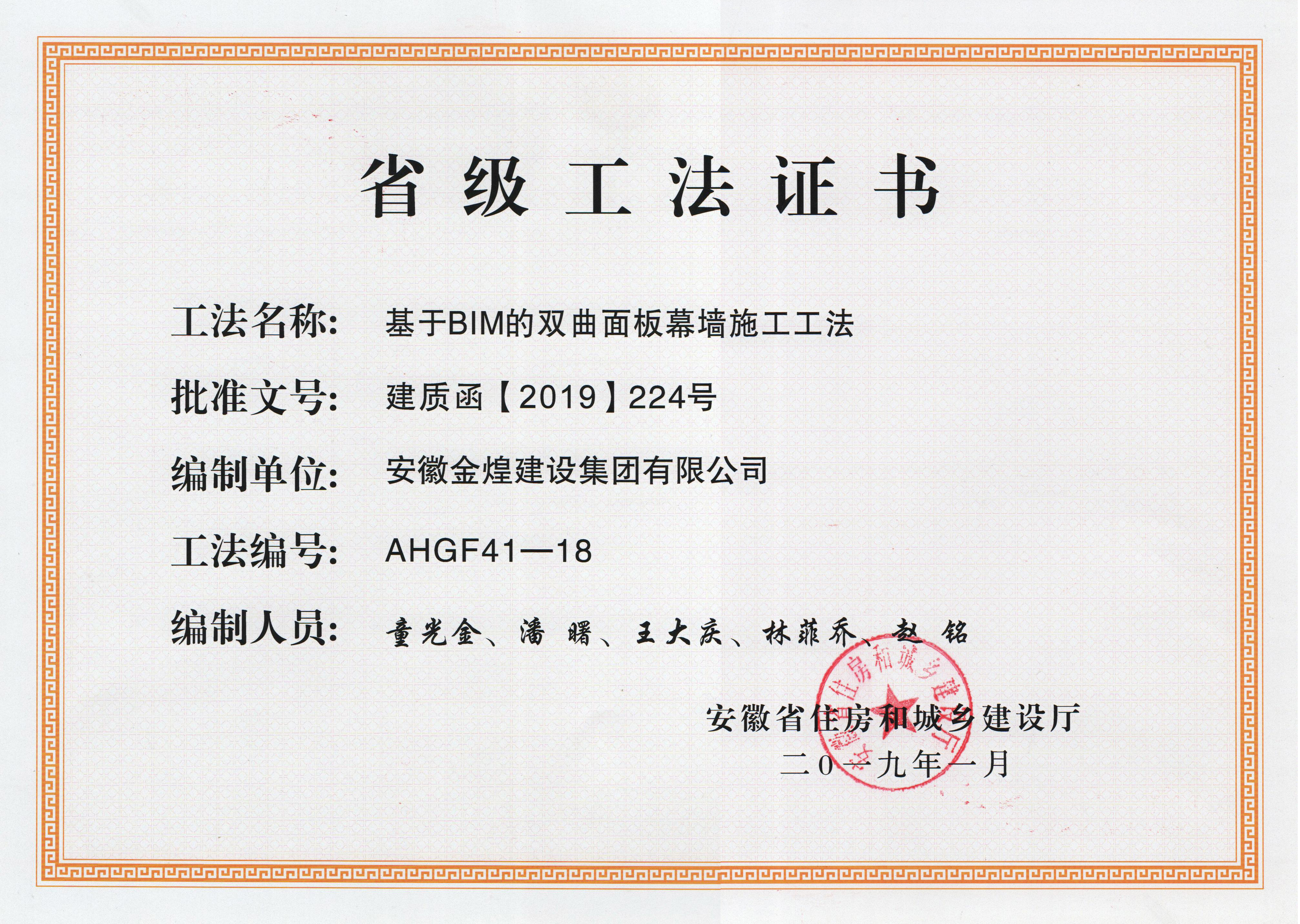 获得2018年度省级工法(基于B...