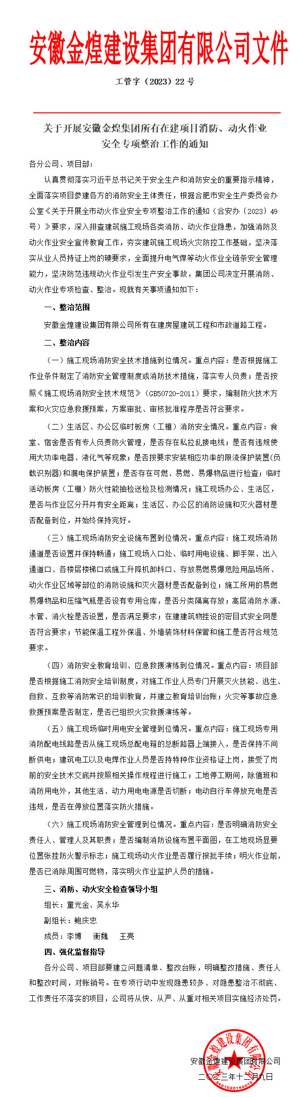关于开展安徽金煌集团所有在建项目消防、动火作业安全专项整治工作的通知