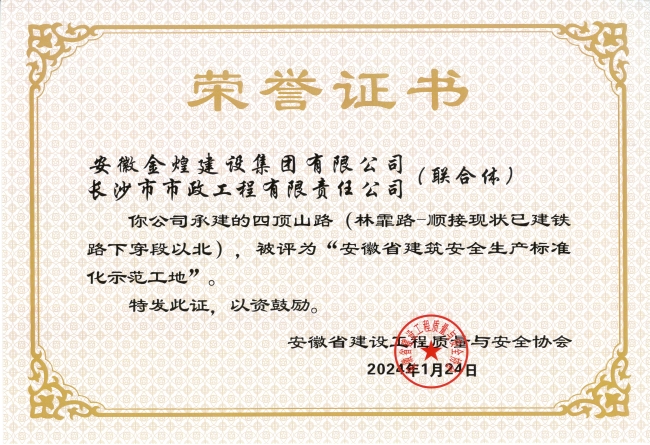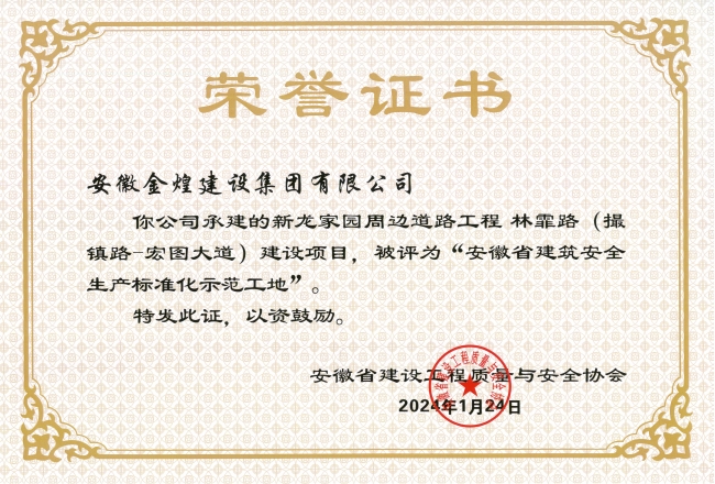 近日,安徽省建设工程质量与安全协会公布2023年度第四批“安徽省建筑安全生产标准化示范工地”名单,我公司承建的四顶山路(林霏路-顺接现状已建铁路下穿段以北)、新龙家园周边道路工程林霏路(撮镇路-宏图大道)建设项目荣获“ 安徽省建筑安全生产标准化工地”荣誉称号。