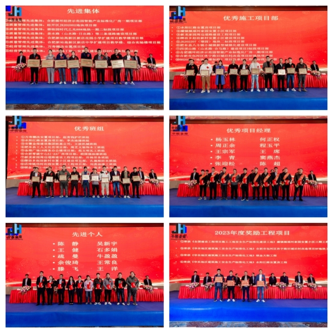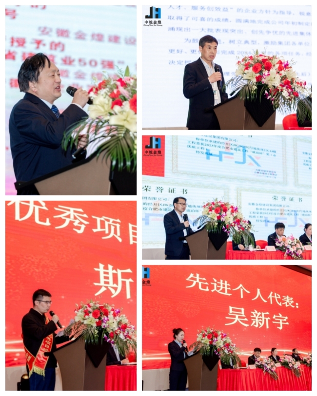 会上,总工程师王大庆同志宣读了《关于表彰2023年度先进集体和先进个人的决定》,财务总监吴本松同志宣读了《安徽金煌建设集团2023年度总结表彰光荣册》,财务副总经理阚涛同志公布了荣获“安徽金煌建设集团2023年度奖励工程项目及奖金”名单。大会对先进集体、优秀施工项目部、优秀班组、先进个人进行了隆重的表彰。其次,优秀项目经理代表斯志浩同志和先进个人代表吴新宇同志把他们在工作中的经验技巧和取得的卓越佳绩与参会人员一起进行了交流,他们用实际行动诠释了责任与担当,为公司的发展作出默默无闻的奉献。