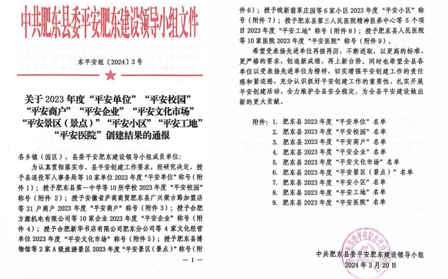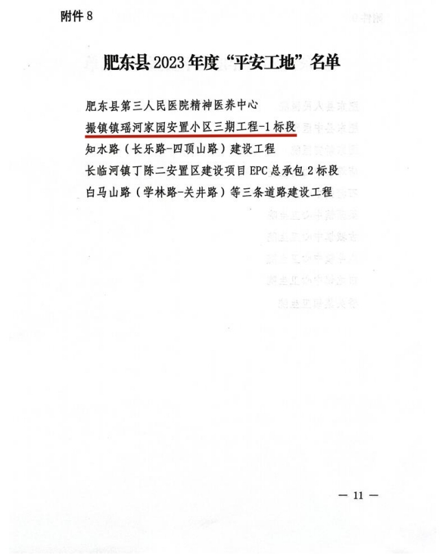 近日,从中共肥东县委平安肥东建设领导小组获悉,我公司承建的撮镇镇瑶河家园安置小区三期工程1标段项目荣获了肥东县2023年度“平安工地”称号。