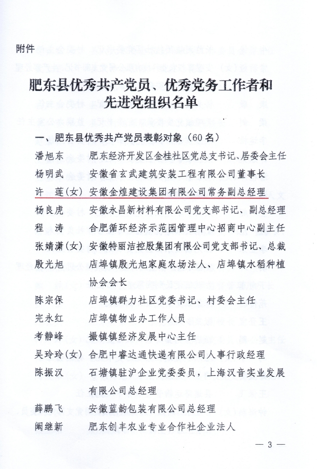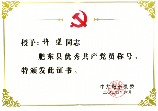 在中国共产党成立103周年之际,肥东县委为表彰先进、树立楷模、弘扬正气,激励全县各级党组织和广大党员坚定信念、奋发向前,决定授予60名优秀共产党员,60名优秀党务工作者,60个肥东县先进党组织。中共安徽金煌建设集团党委委员、常务副总经理、工会主席许莲同志经肥东县委组织部综合资深,严格考察公示,推选为肥东县优秀共产党员候选人,最终荣获2024年度肥东县优秀共产党员称号,同时也是肥东县非公党企获此殊荣的代表。