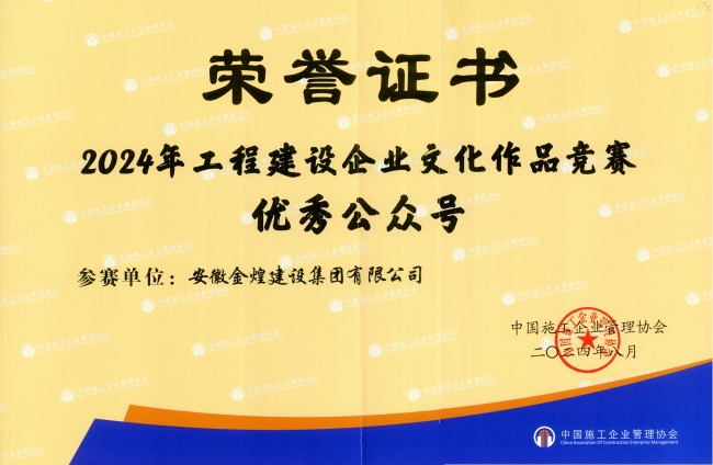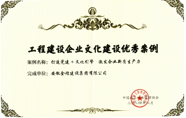 在本次表彰大会中获悉,金煌集团选报的《打造党建+文化引擎 激发企业新质生产力》的企业文化案例脱颖而出,被评为2024年度工程建设企业文化建设优秀案例。同时安徽金煌建设集团企业网站和中皖金煌企业微信公众号被中国施工企业协会评为工程建设企业文化优秀成果奖。