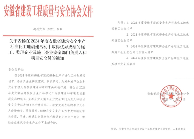近日,安徽省建设工程质量与安全协会发布《2024年度安徽省建筑安全生产标准化工地创建活动的表彰通知》,对在安全生产标准化建设中表现突出的优秀企业、安全管理负责人及项目经理予以表彰,旨在树立行业标杆,强化示范引领作用。