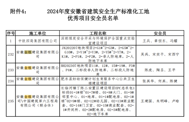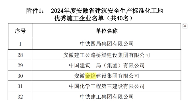 在此次表彰中,安徽金煌建设集团有限公司凭借着卓越的安全生产管理成效,荣获“2024年度安徽省建筑安全生产标准化工地优秀施工企业”称号。作为安徽省建筑行业的领军企业,金煌建设集团始终将安全生产放在首位,严格落实国家和地方的安全生产政策,积极推进施工现场的标准化管理。通过科学的管理体系、严格的安全培训和高效的应急预案,为全省建筑行业的安全生产树立了标杆。