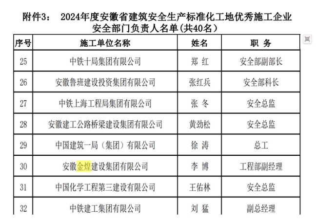 安徽金煌建设集团工程部副经理李博同志凭借其在安全生产管理中的突出贡献,荣获2024年度安徽省建筑安全生产标准化工地优秀施工企业安全部门负责人称号。李博同志长期致力于施工现场的安全管理工作,始终坚持“安全第一、预防为主、综合治理”的方针,带领团队建立健全了企业安全生产管理体系,确保了各项安全措施的落实。他的出色工作不仅为企业的安全生产保驾护航,也为全省建筑行业的安全管理提供了宝贵的经验。