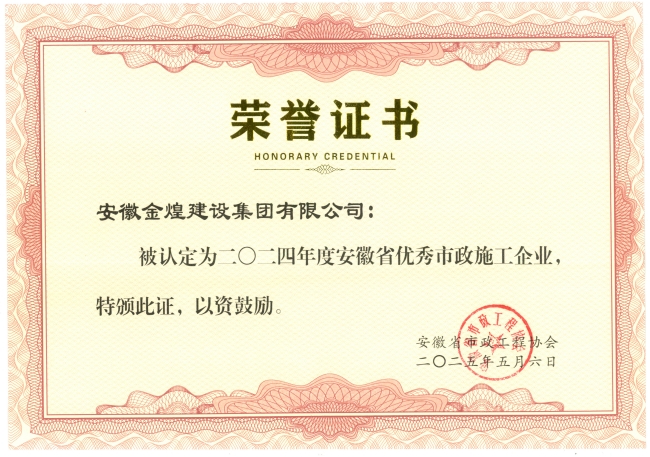 近日,从安徽省市政工程协会和合肥市市政工程协会传来喜讯,金煌集团凭借在市政工程领域的卓越表现,荣获2024年度安徽省优秀市政企业和合肥市优秀市政企业称号。同时,公司选报的董泽山、吴红锁两位同志,凭借丰富的项目管理经验和出色的领导能力,被评为安徽省和合肥市市政施工企业优秀项目经理。