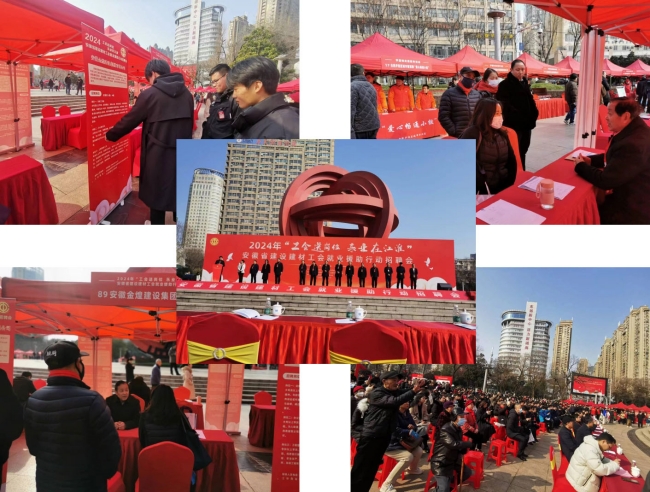 由安徽省建设建材工作工会举办的2024年“工会送岗位 乐业在江淮”安徽省建设建材工会建筑业专场就业援助行动线下招聘会于3月2日上午9点在合肥市瑶海区和平广场举办,金煌集团工会积极响应并参加招聘。集团总顾问吴梧生等相关负责人前往招聘会现场。