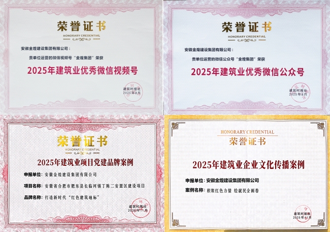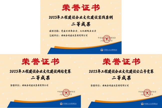 从中国施工企业管理协会发布《关于推广2025年工程建设企业文化建设系列活动成果的通知》获悉,安徽金煌建设集团有限公司申报的三项成果全部通过,其中企业文化建设实践案例《党建引领聚合力 文化铸魂显活力》、企业网站、微信公众号竞赛分别荣获二等成果。从《建筑时报》获悉,集团荣获2025年度优秀微信公众号、优秀微信视频号,集团公司申报的《打造新时代 红色建筑地标》案例入选2025年建筑业项目党建品牌案例,《积聚红色力量 绘就民企画卷》案例入选2025年建筑业企业文化传播案例。