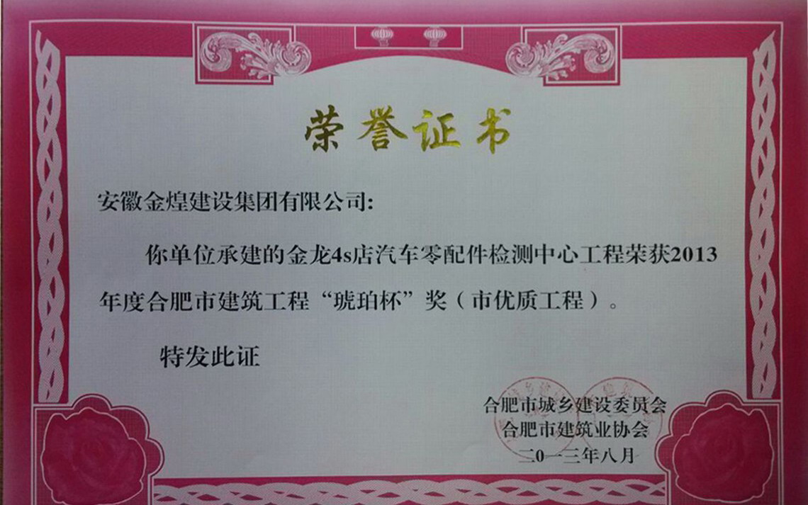 近期合肥市建设网公布,由安徽金煌建设集团有限公司承建的金龙4s店汽车零配件检测中心荣获合肥市建筑工程“琥珀杯”奖(市优质工程)。