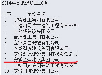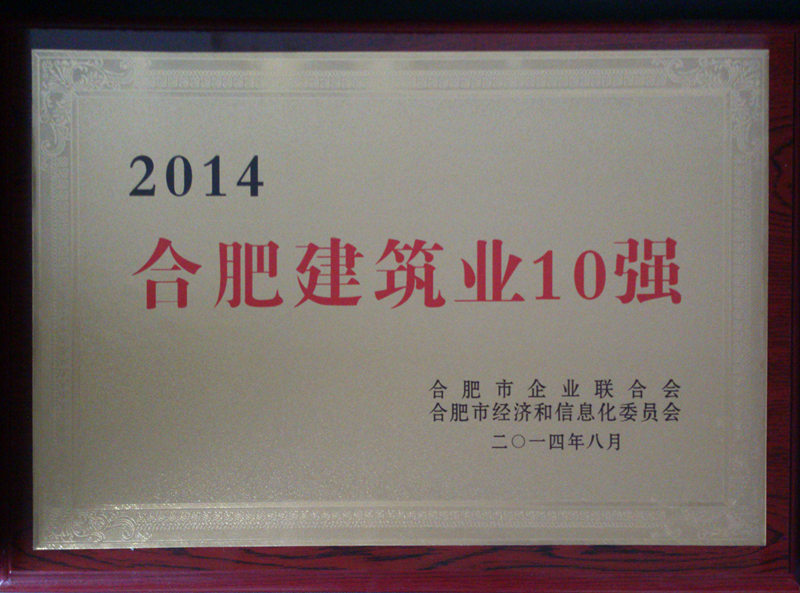 8月29日上午,2014年度合肥企业五十强新鲜“出炉”,又一批体量大、实力强的工业企业,傲立在资本与工业经济的“江湖”。 在表彰大会上,合肥市2012-2013年度优秀企业家、2014合肥企业五十强名单最终揭晓。我单位入选为2014年度合肥市建筑业10强企业。 合肥市企业联合会、企业家协会暨工业经济联合会会长谢刚表示,获得荣誉的这些优秀的企业家在企业管理、诚信经营、遵纪守法、创新发展,尤其在社会责任、转型升级、节能减排等方面具有显著的引领示范作用,“他们具有高度的社会责任感、强烈的改革创新意识,以及顽强的拼搏精神,所在企业也基本上都有一个或几个技术含量高、质量好、名气大的主导产品和品牌,形成了企业自身发展的顶端优势。”它们是地方经济发展态势的“晴雨表”,也是一座城市砥砺崛起、扬帆远航的“主舵手”。